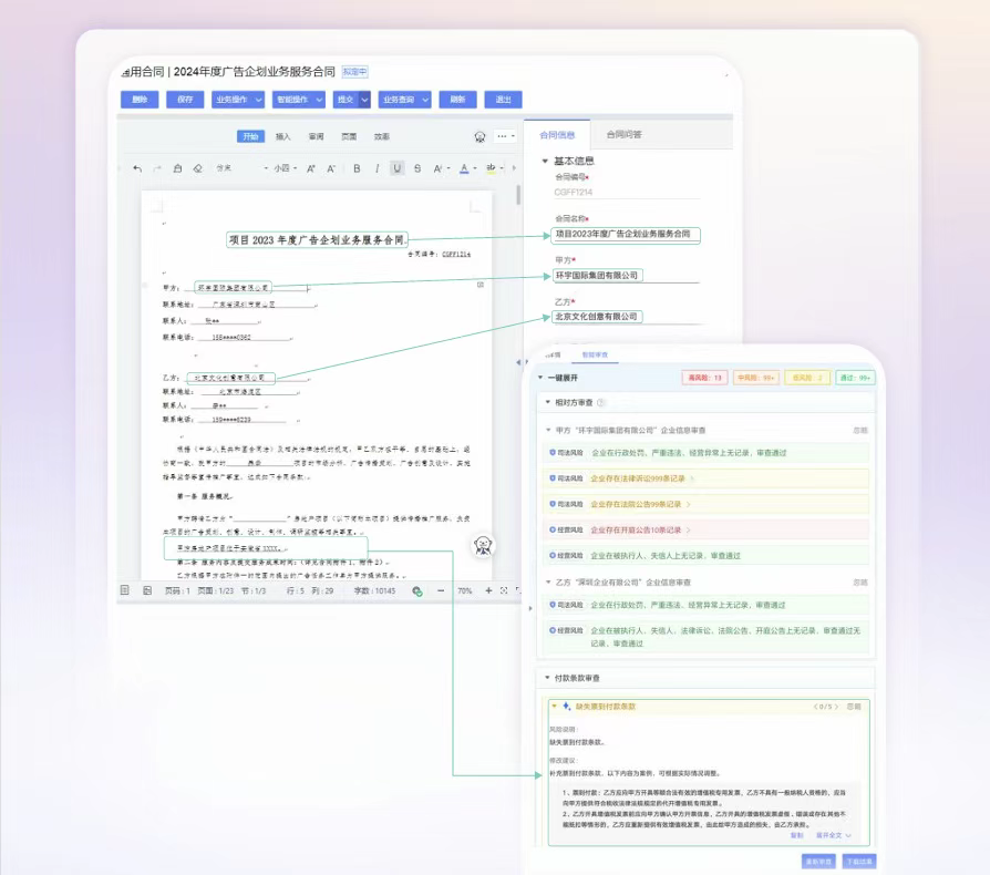 - 自動查風險:自備法規庫 + 公司規則,標紅合約漏洞,如 “違約責任不明確”