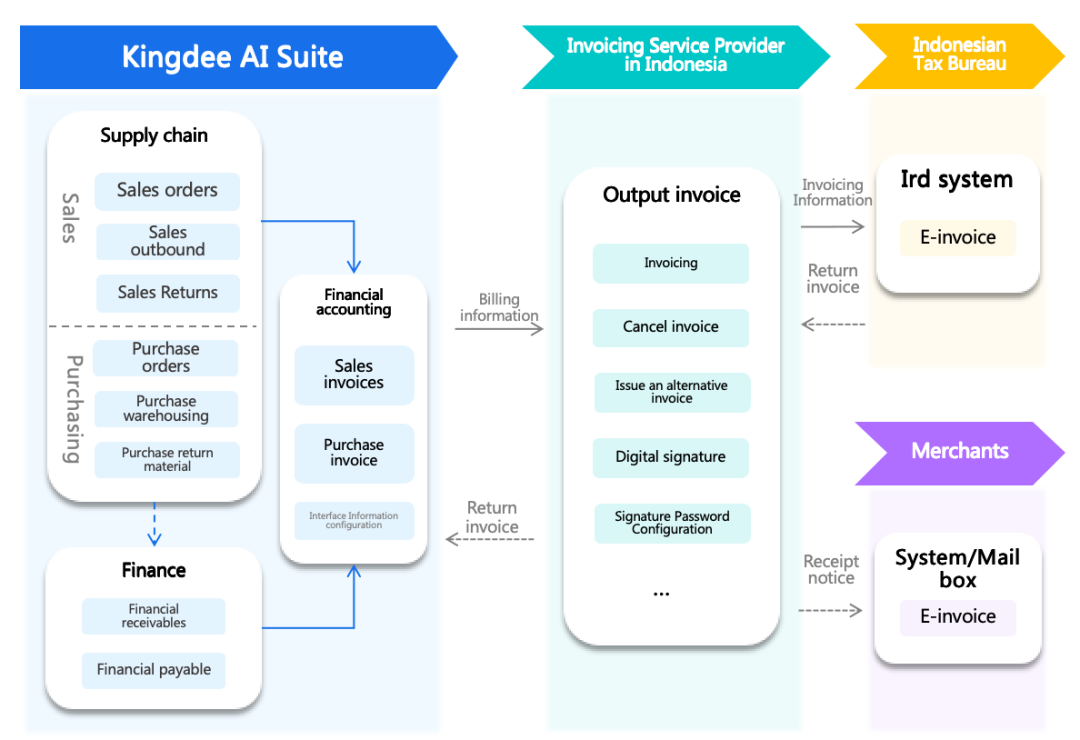 By integrating local compliant invoice services, Kingdee AI Suite facilitates efficient and stable issuance of e-invoices. Invoicing information is generated based on business and financial data without manual repeated entry, significantly improving the efficiency and operational convenience of localized invoice compliance management in Indonesia. It ensures precise correspondence between business data and e-invoices, realizing full-process traceability.