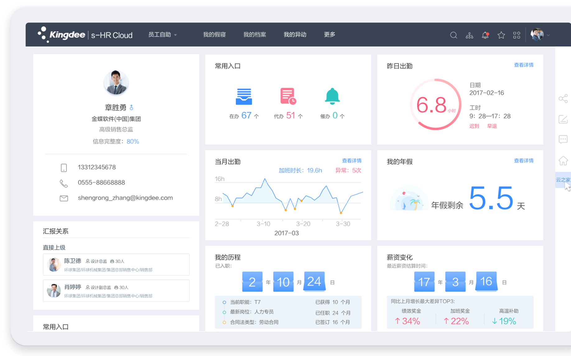 金蝶HR雲端系統界面簡潔直觀,按角色業務導向,可實現直覺式應用,令用戶得到最佳體驗